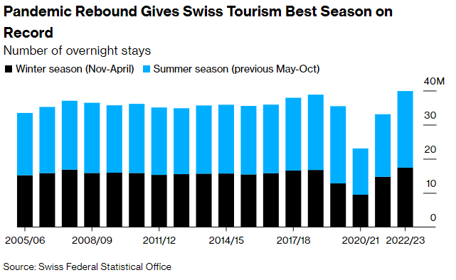 强劲的法郎并没有阻止国际旅行者上个冬季前往瑞士旅游,因为更多的游客选择在疫情期间节省下来的钱用于前往阿尔卑斯国家的旅行。然而,来自国外的需求仍低于2018-2019年的8.8百万个夜晚的疫情前水平,表明还有进一步的追赶潜力。