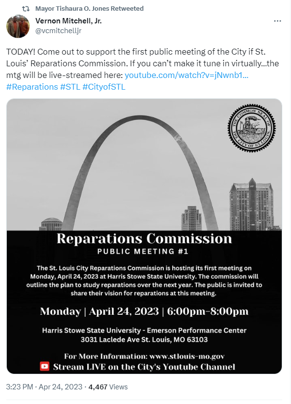 在圣路易斯的哈里斯-斯托州立大学的一个小型栗色和棕色礼堂里,一个由九名成员组成的委员会开始了其第一次公开会议,审查赔偿问题。市长蒂莎乌拉·琼斯在三月任命了这个小组,以研究对该市的黑人居民和被奴役人的后代进行赔偿的形式。
