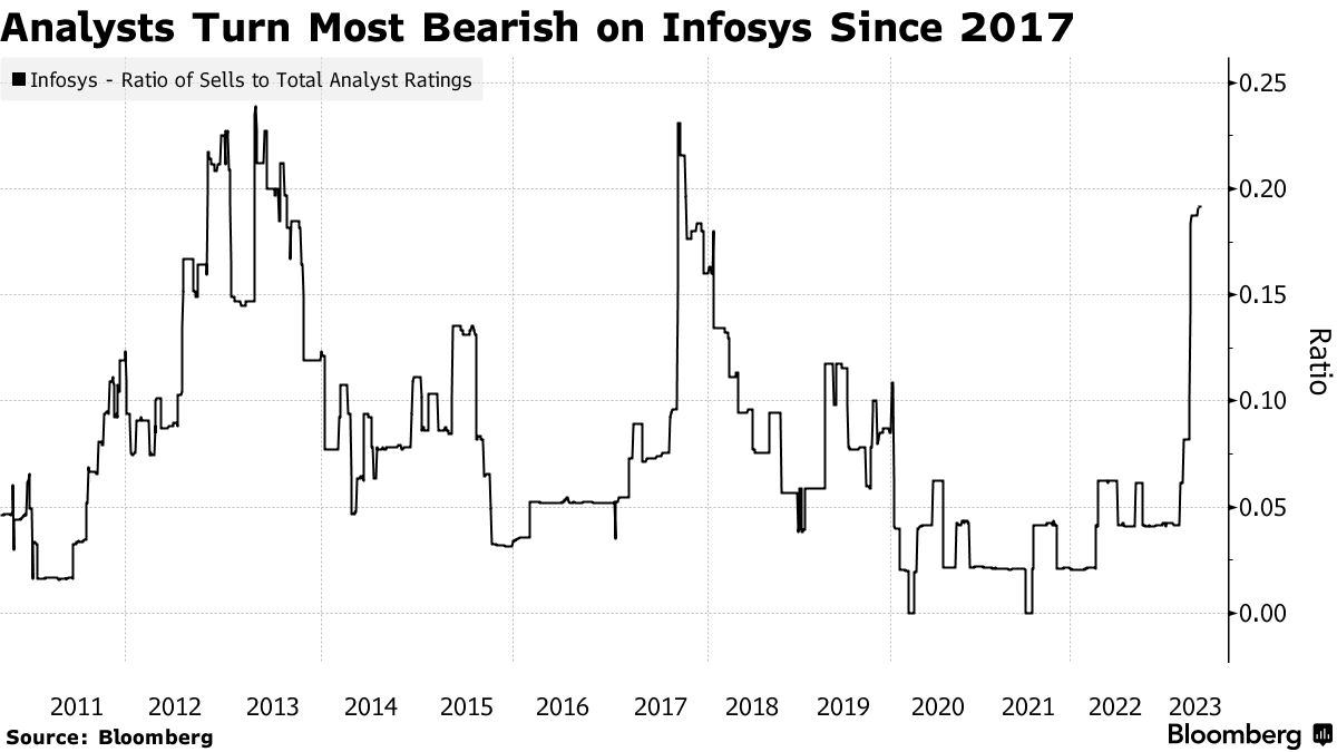 自3月中旬以来,至少有七位分析师将该股票的评级下调至卖出,原因是担心美国银行由于地区银行健康状况的担忧而减少了IT支出。Infosys对本财年的销售预测令人失望,加剧了负面消息的传播。