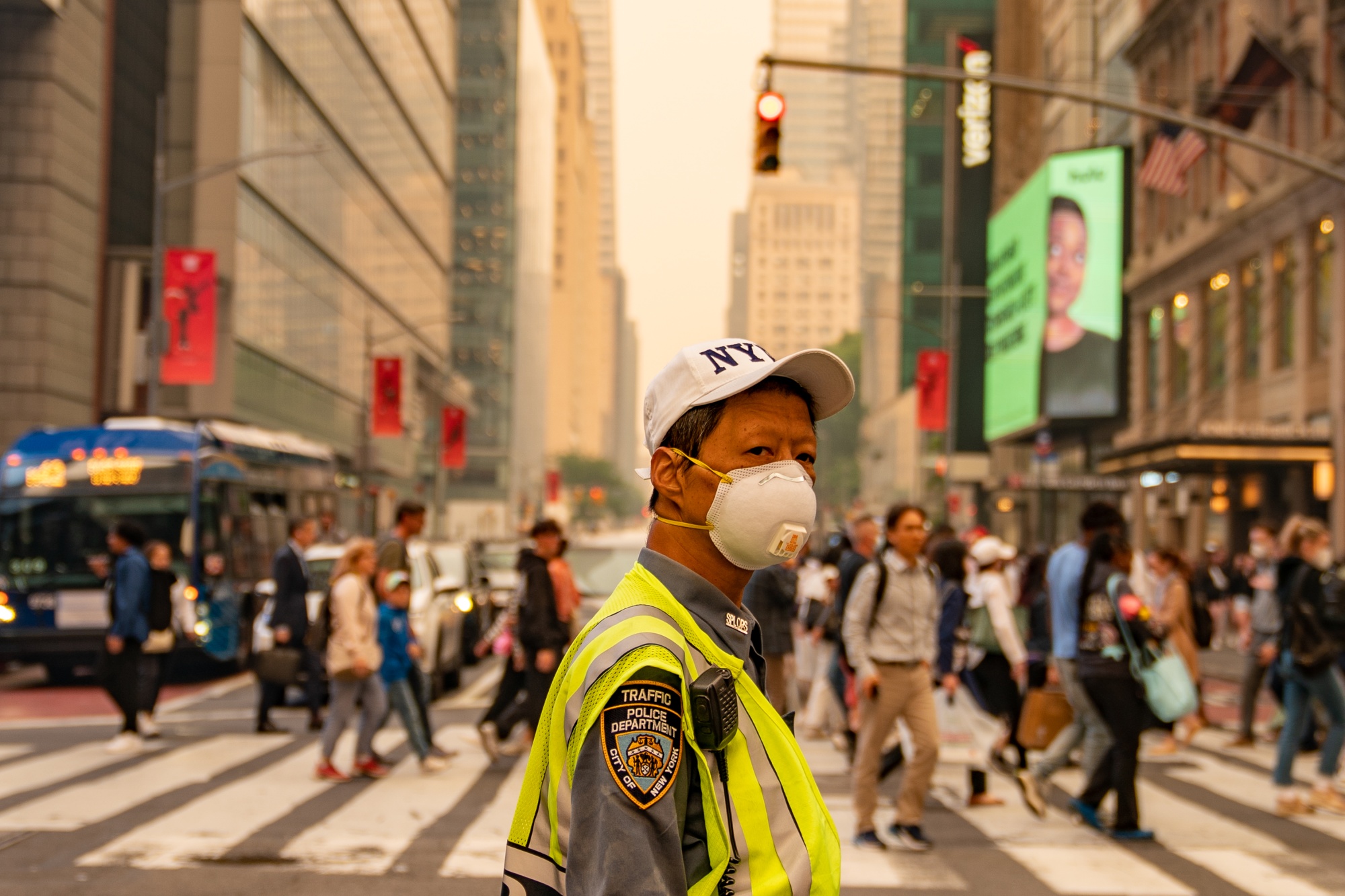 6月7日,纽约时代广场一名交通警察戴着口罩在烟雾弥漫中行走。摄影师:David Dee Delgado/Getty Images