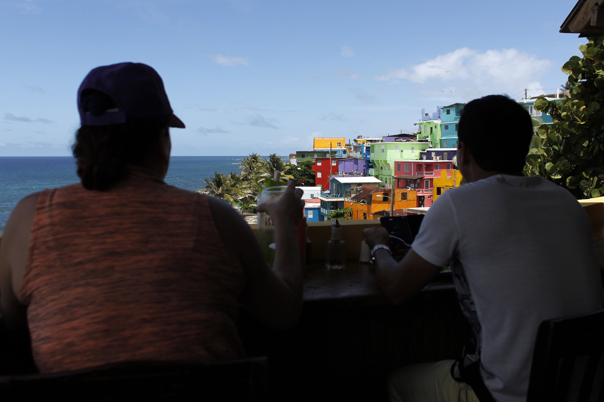 一对夫妇在圣胡安的一家餐厅用餐。