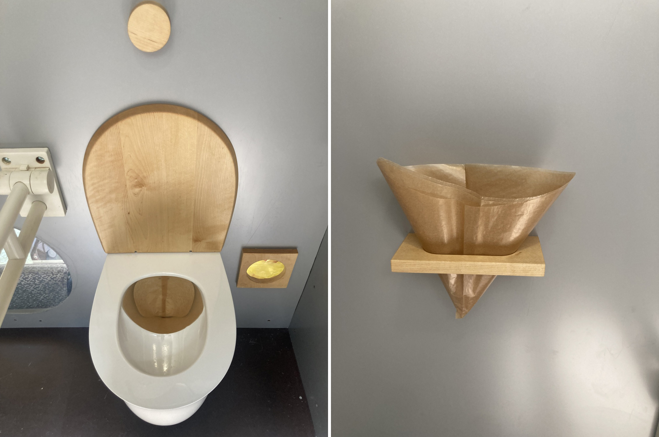 芬兰并不是唯一一个在双年展上考虑更节约的厕所的国家。作为一个探讨更广泛再利用问题的展览的一部分,德国的展馆也展示了一种无水厕所 —— 与芬兰的Huussi不同,这种厕所实际上可以在当前位置使用。这种方法在另一个层面上略有不同 —— 它不是将多余的尿液从共用的储罐中移除,而是将液体和固体废物分开存放在碗中的两个不同储罐中。