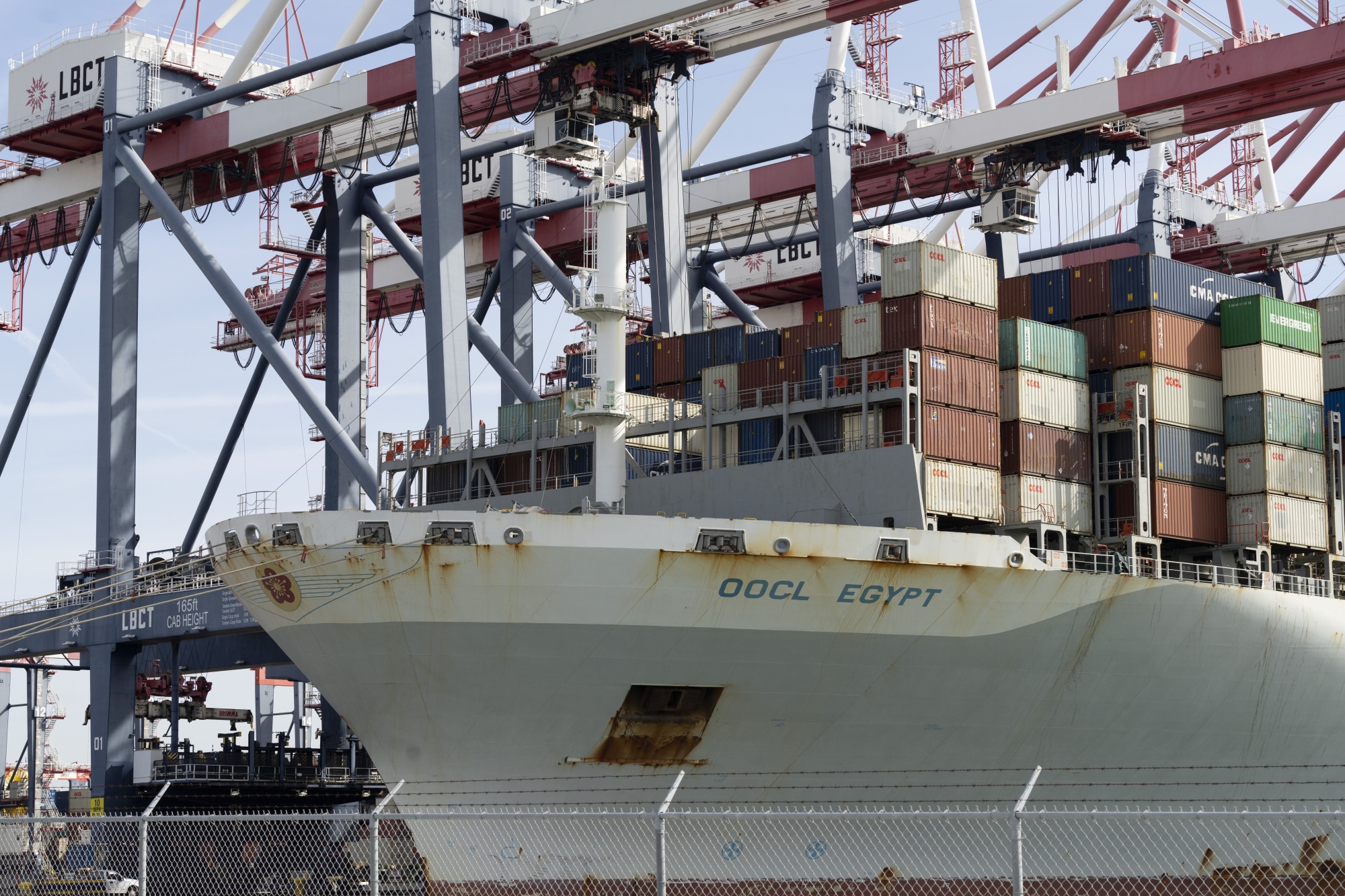 一艘货船停靠在加利福尼亚州长滩港的LBCT集装箱码头。