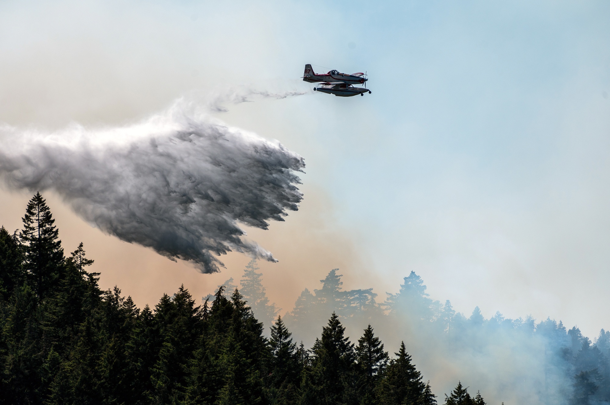 一架固定翼水上灭火飞机在2023年6月6日向加拿大不列颠哥伦比亚省Port Alberni附近的卡梅伦悬崖野火投放水。如果土地燃烧速度保持不变,加拿大将迎来有史以来最严重的野火季节。