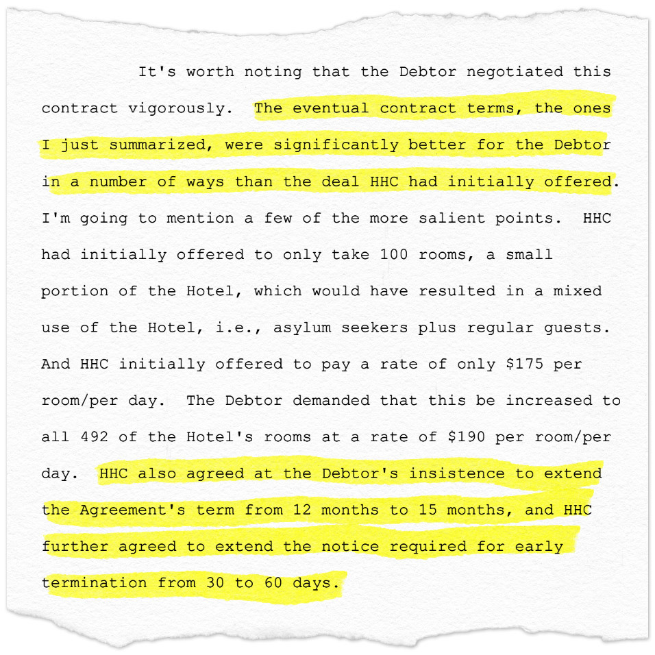 在金融区的假日酒店之外,该酒店在2022年3月违约了1.37亿美元贷款后进入了破产清算程序,一些现在被用来庇护移民的酒店似乎在与市政府达成协议之前已经关闭或处于极度财务困境中。