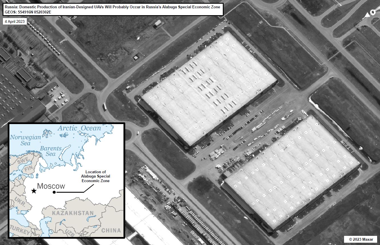 国家安全委员会发言人约翰·柯比表示,无人机工厂“可能在2024年初完全投入运营”,可能位于莫斯科以东约650英里(1040公里)的一个工业区,他分享了美国政府对俄罗斯阿拉布加特别经济区的两栋建筑的卫星图像,该区位于鞑靼斯坦。