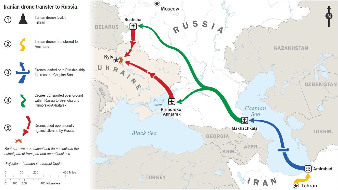 乔·拜登总统的政府分享了新解密的情报,称伊朗正在利用里海航线,通过俄罗斯船只将其无人机从伊朗阿米拉巴德港经俄罗斯运往马哈奇卡拉。