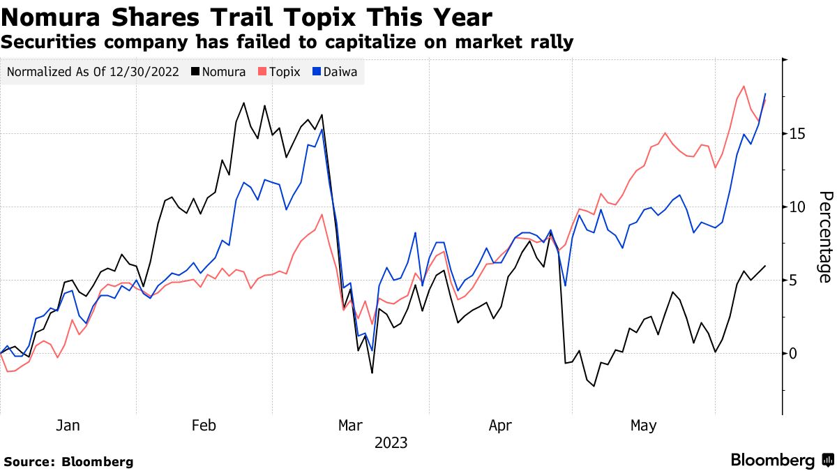 今年,野村的股价上涨了6%,低于基准Topix指数的17%涨幅,该指数早些时候触及33年来的高点。竞争对手 大和证券集团股份有限公司上涨了18%。