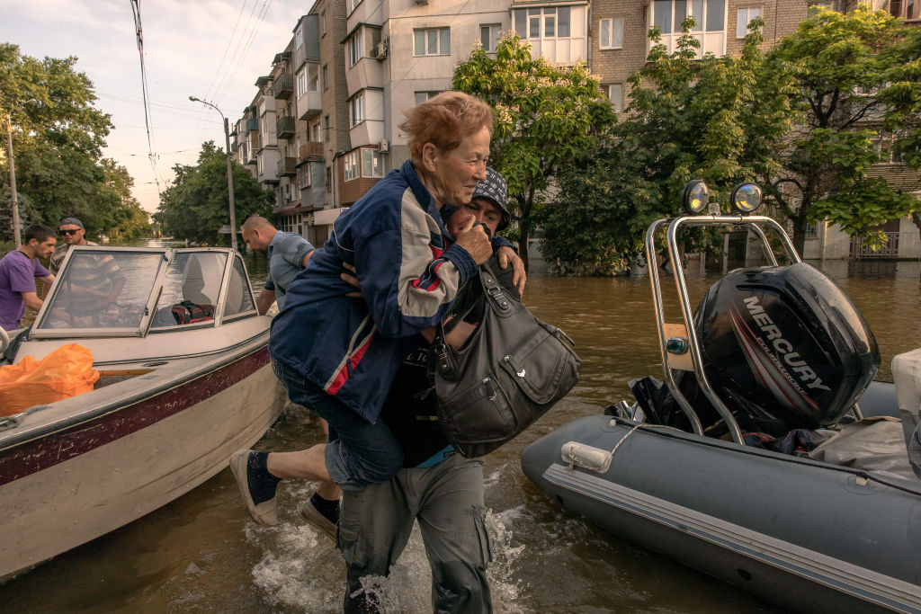 一名男子搬运一名从克尔松被洪水淹没地区疏散出来的老妇人,6月9日。