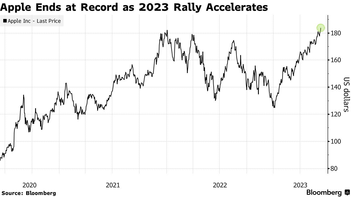 股价上涨1.6%,收于183.79美元。这是自2022年1月以来苹果的首次收盘高点,尽管在上周推出Vision Pro混合现实头盔后曾创下盘中纪录。当天的涨幅使苹果2023年的涨幅超过41%,而纳斯达克100指数的涨幅为35%。