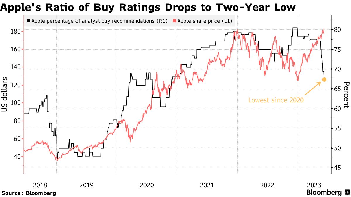 瑞银集团是最新一家退后一步的经纪商,本周将这家科技巨头的评级从买入调降至中性。根据彭博编制的数据,这使得苹果公司获得了67%的分析师买入评级,这是自2020年底以来的最低水平,也是所有大市值同行中最差的。