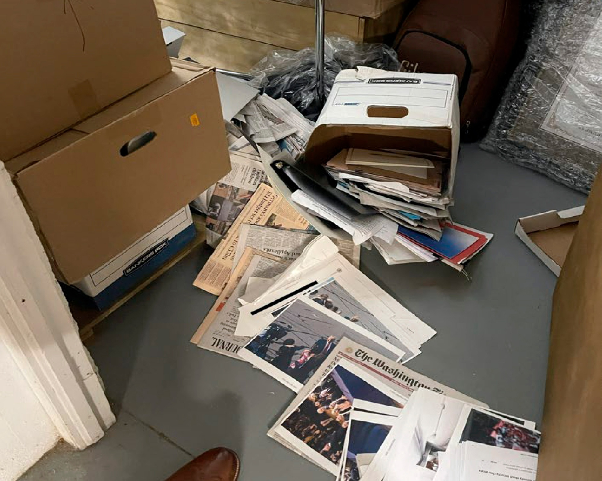 这张图片包含在对前总统唐纳德·特朗普的起诉书中,显示2021年12月7日,特朗普在佛罗里达州棕榈滩的马阿拉戈庄园的一个储藏室里,记录箱倒塌,内容物洒落在地板上。来源:司法部检察官引用特朗普在2016年总统候选人和当选总统后谈论保护机密信息的言论。他们将此与他们声称显示他在2021年承认自己在任内保留了一份未解密的军事“攻击计划”的录音副本进行对比,Siegmann说。