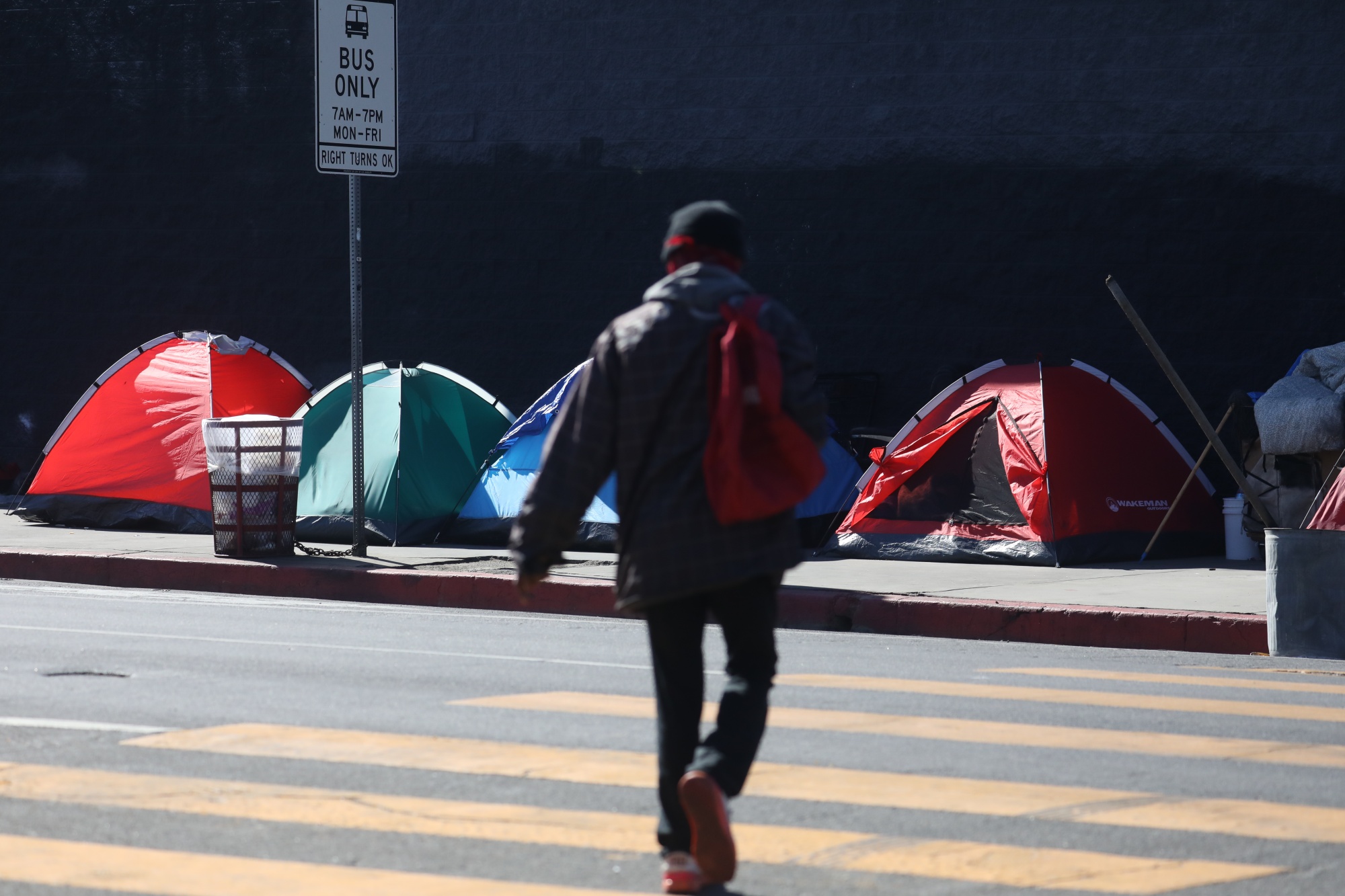 一名经历无家可归的人走向他们在美国加利福尼亚州洛杉矶斯基德罗社区的帐篷。拍摄于2022年2月24日,摄影师:大卫·斯旺森/彭博社摄影师:大卫·斯旺森/彭博社管理团队通过巴斯的标志性“内部安全”计划将人们带入,该计划在酒店和汽车旅馆提供即时住所,并提供通往支持性住房的途径,以及通过紧急券或提供永久住所的项目。