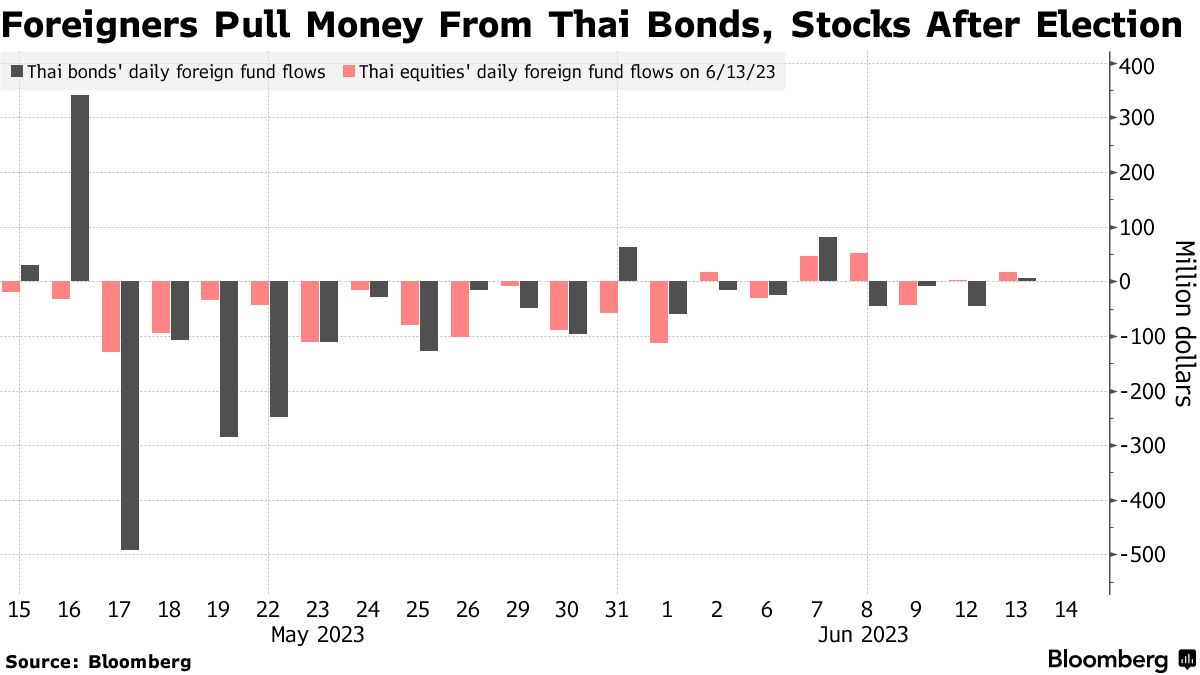 源自对皮塔组建政府的法律挑战的政治不确定性,即使亲民主党派在5月14日的选举中大获全胜,也使投资者感到不安。自投票以来,他们已经从泰国股票和债券市场撤出净额20亿美元,泰铢已贬值超过2.5%,接近三个月低点。