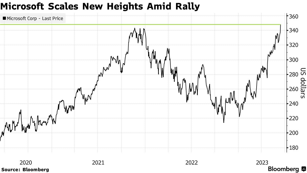 这家Windows软件制造商上涨3.2%,至348.10美元,突破了自2021年11月19日以来一直保持的收盘高点。这一涨幅使微软今年以来的涨幅达到45%,为其市值增加了约8006亿美元。