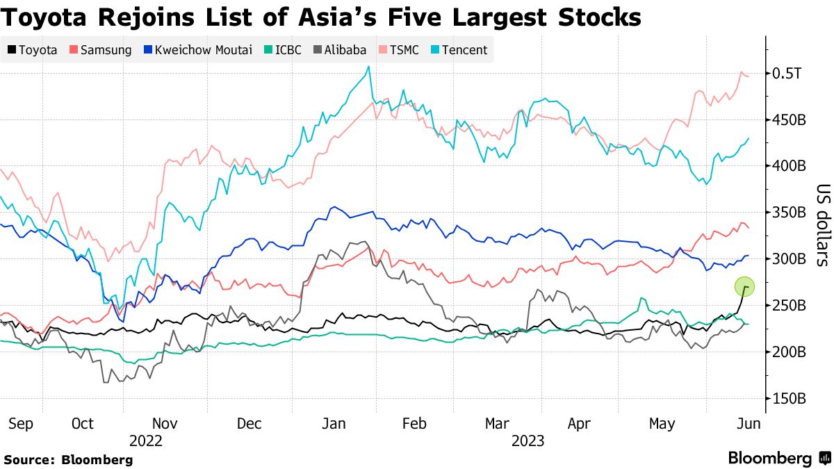 在最新的涨幅之后,丰田的股价现在接近三星电子和贵州茅台的规模。台湾积体电路制造股份有限公司和腾讯控股有限公司仍然牢牢掌握该地区的前两名。