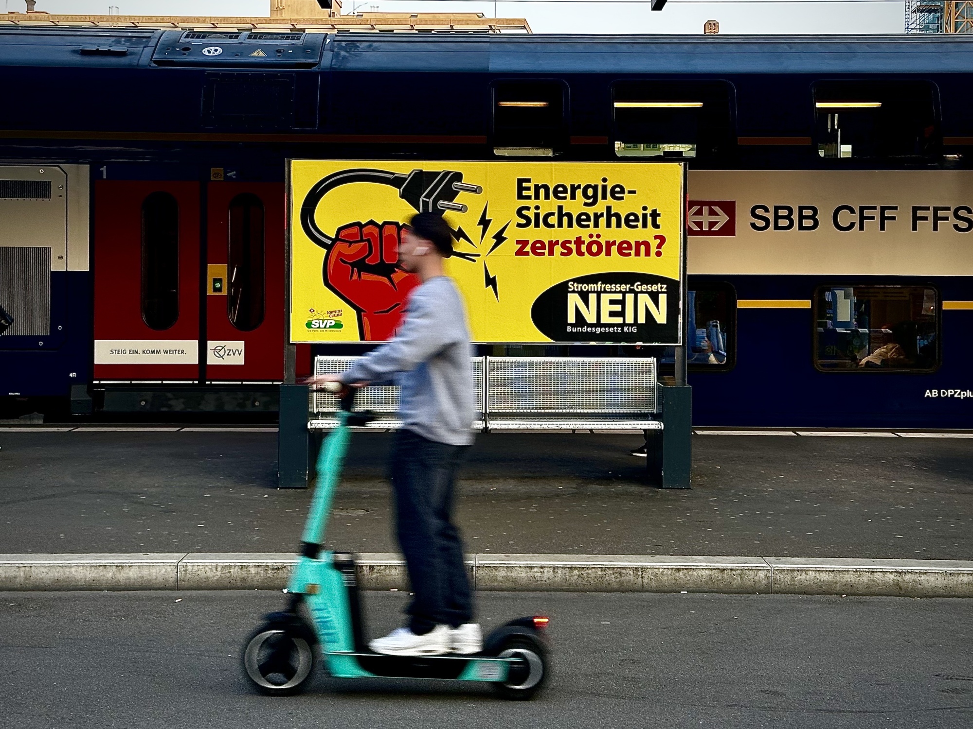 一个骑着滑板车的司机在六月初经过苏黎世-厄利孔火车站的“不”运动广告牌。