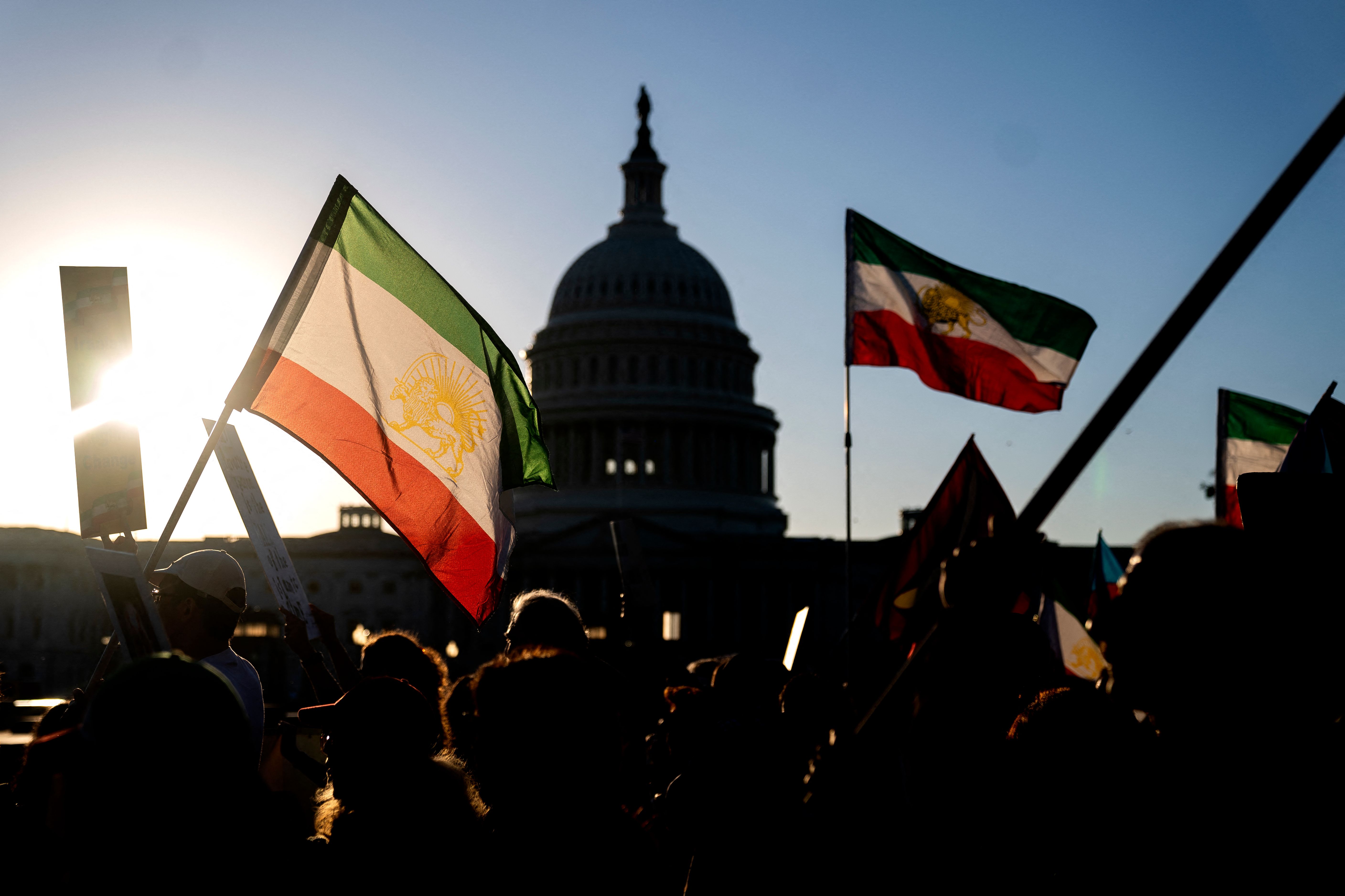 示威者在2022年10月的“伊朗团结游行”期间在华盛顿特区美国国会大厦前挥舞伊朗国旗。