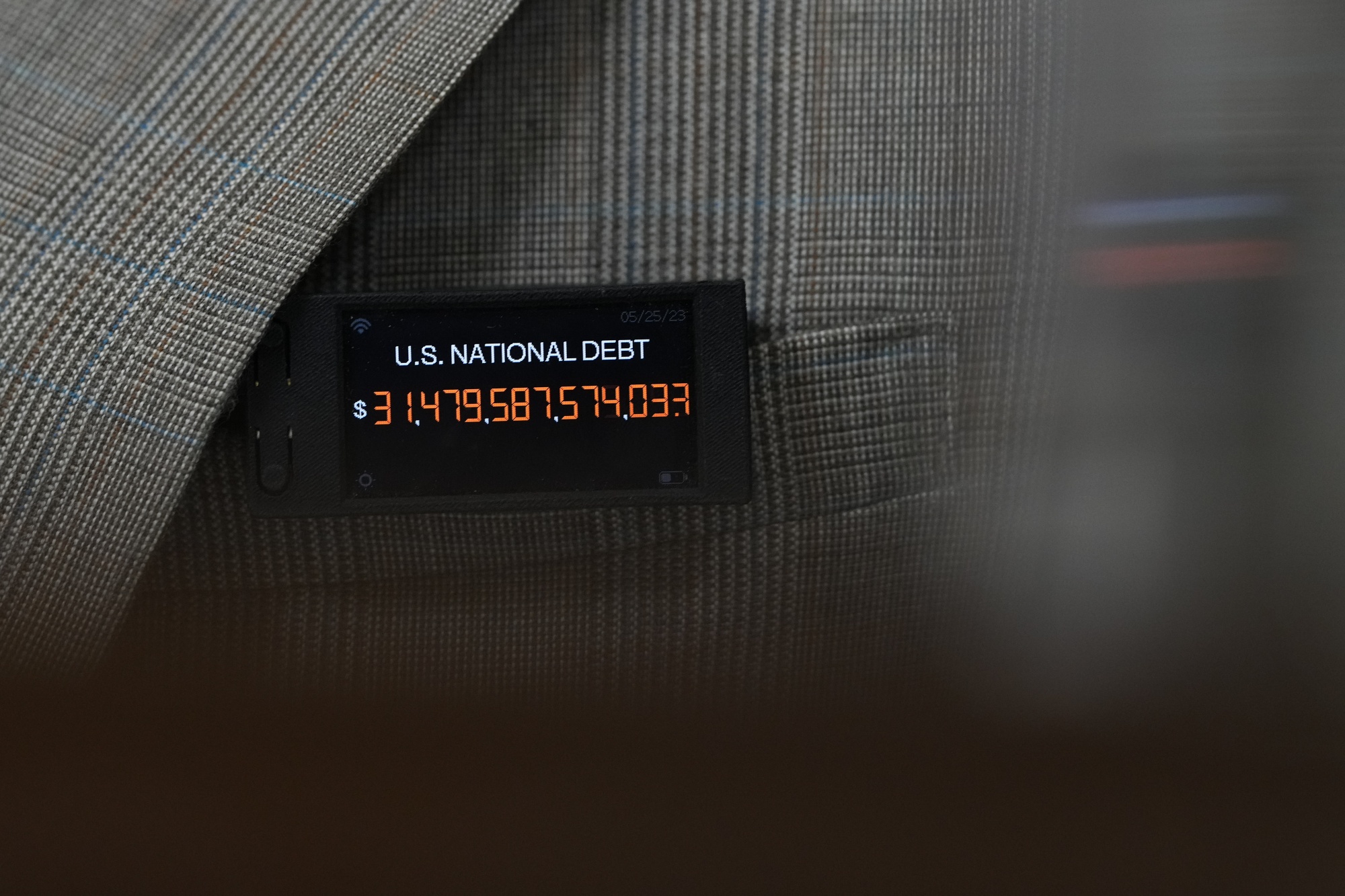 在华盛顿特区展示美国国债的徽章。摄影师:Drew Angerer/Getty Images目前的协议中,民主党同意进行适度的支出削减和福利改革,以换取将上限暂停至2025年,这减弱了可能需要做出明确裁决的紧迫性。