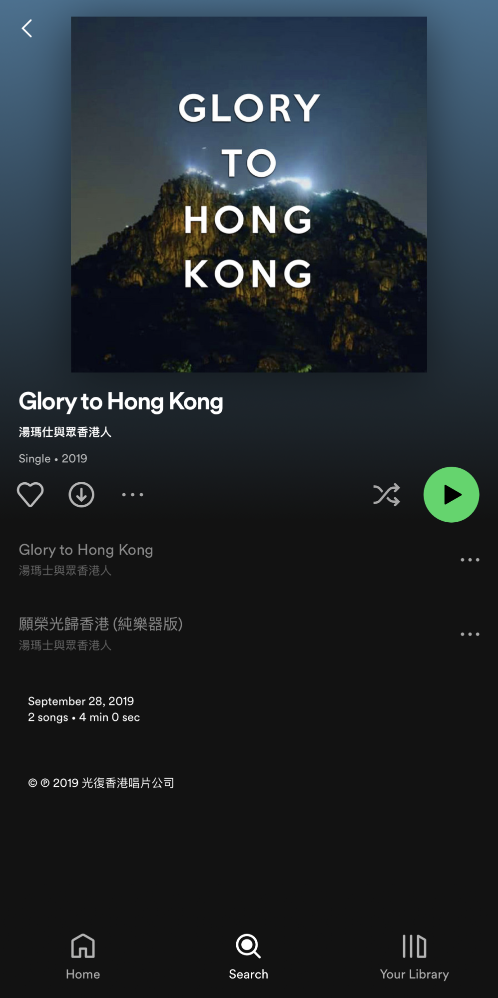 《荣光归香港》的变体于6月14日在Spotify上不可用。来源:Spotify这首歌曲的热门版本也在周三晚上无法在Spotify Technology S.A上播放。