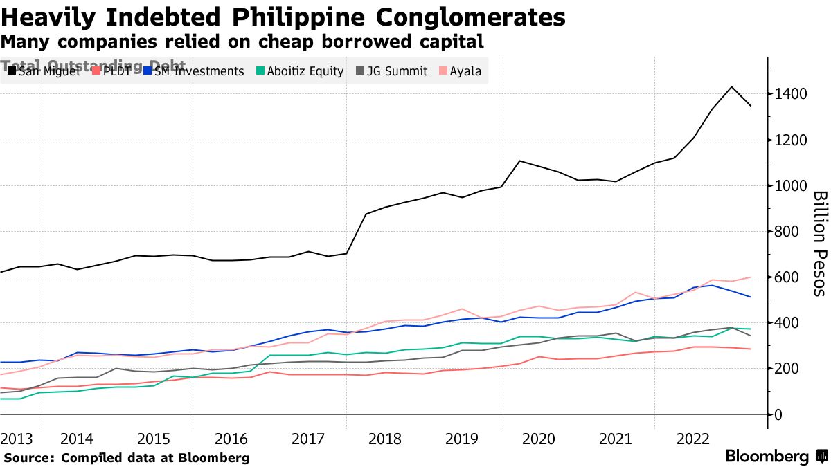 菲律宾负债最严重的公司是食品到电力企业集团 圣米格尔公司,根据彭博编制的数据,截至3月底,其总未偿债务为1.35万亿比索(241亿美元)。接下来负债最重的是同行企业集团 艾哈拉公司 和 SM投资公司