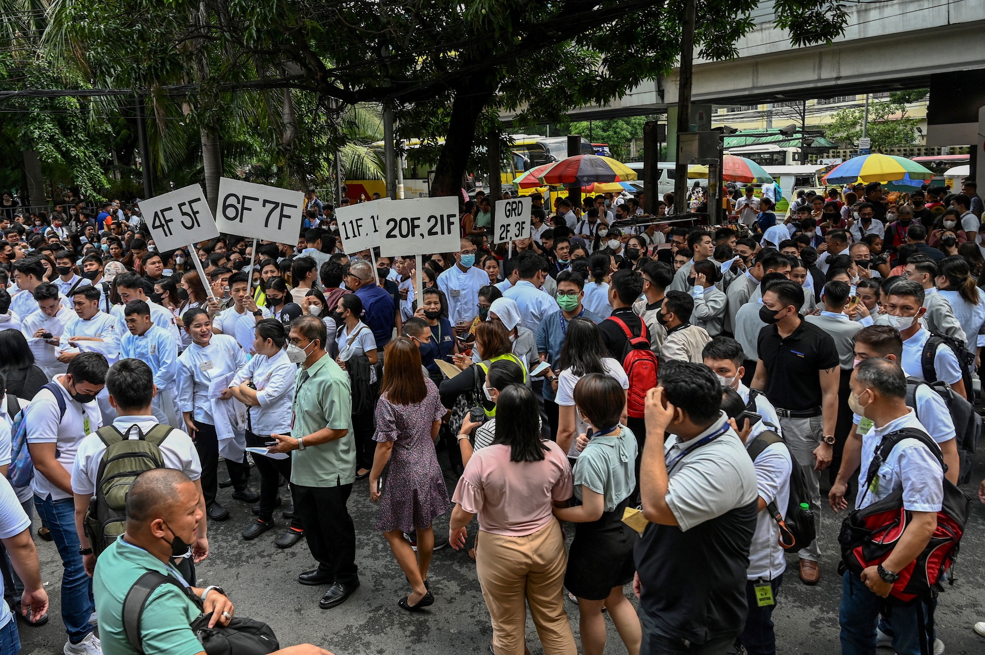 人们在6月15日撤离马尼拉一栋建筑后聚集在街上。