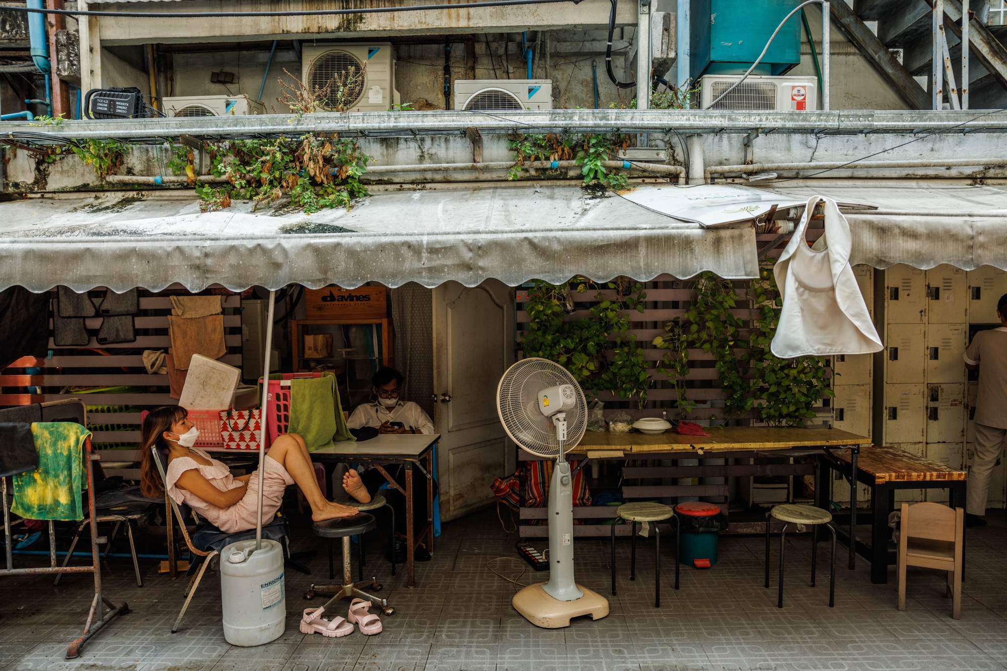 居民们在2023年4月25日星期二在泰国曼谷的风扇前休息。