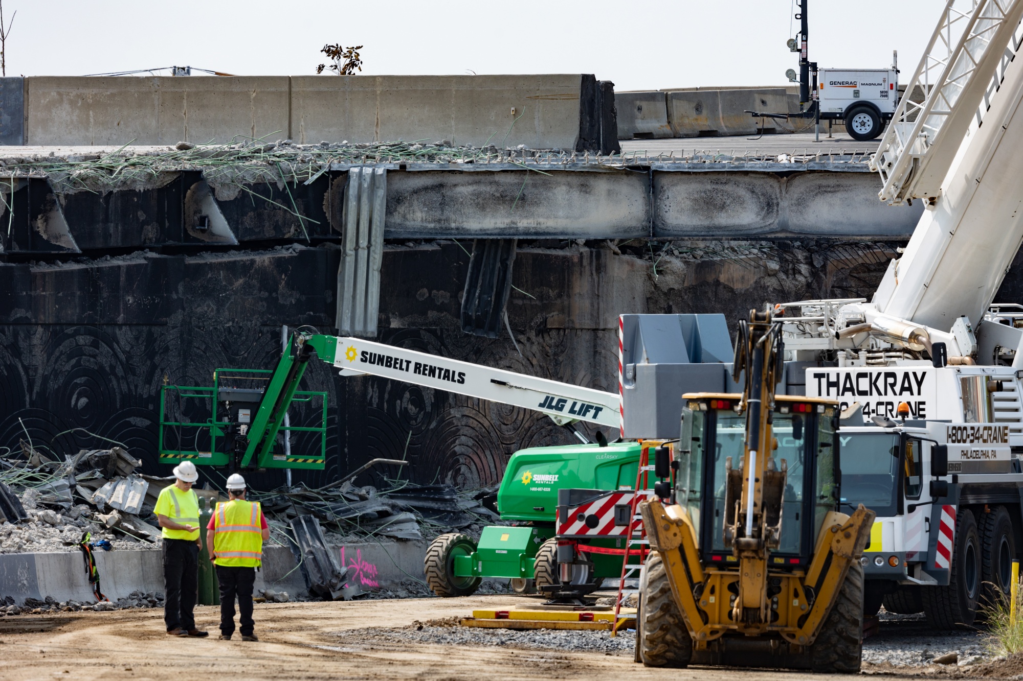 工人们在6月15日清理费城一座坍塌桥梁的残骸。摄影师:汉娜·贝尔/彭博社美国交通部长皮特·布泰吉格重申政府将迅速做出回应,以恢复费城坍塌的95号州际公路桥,称预计将在“几周内”重新开放。