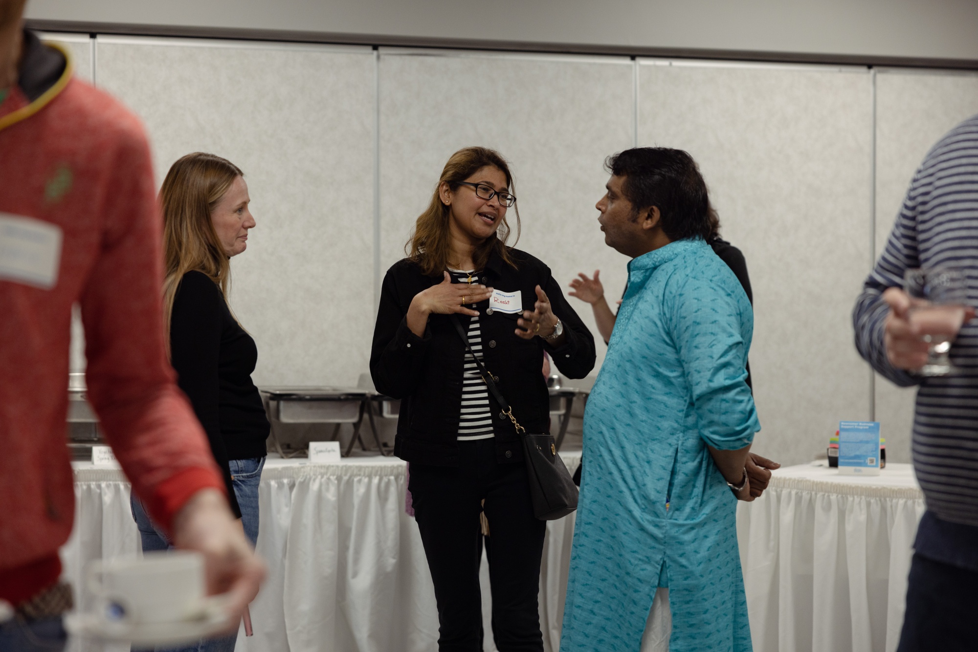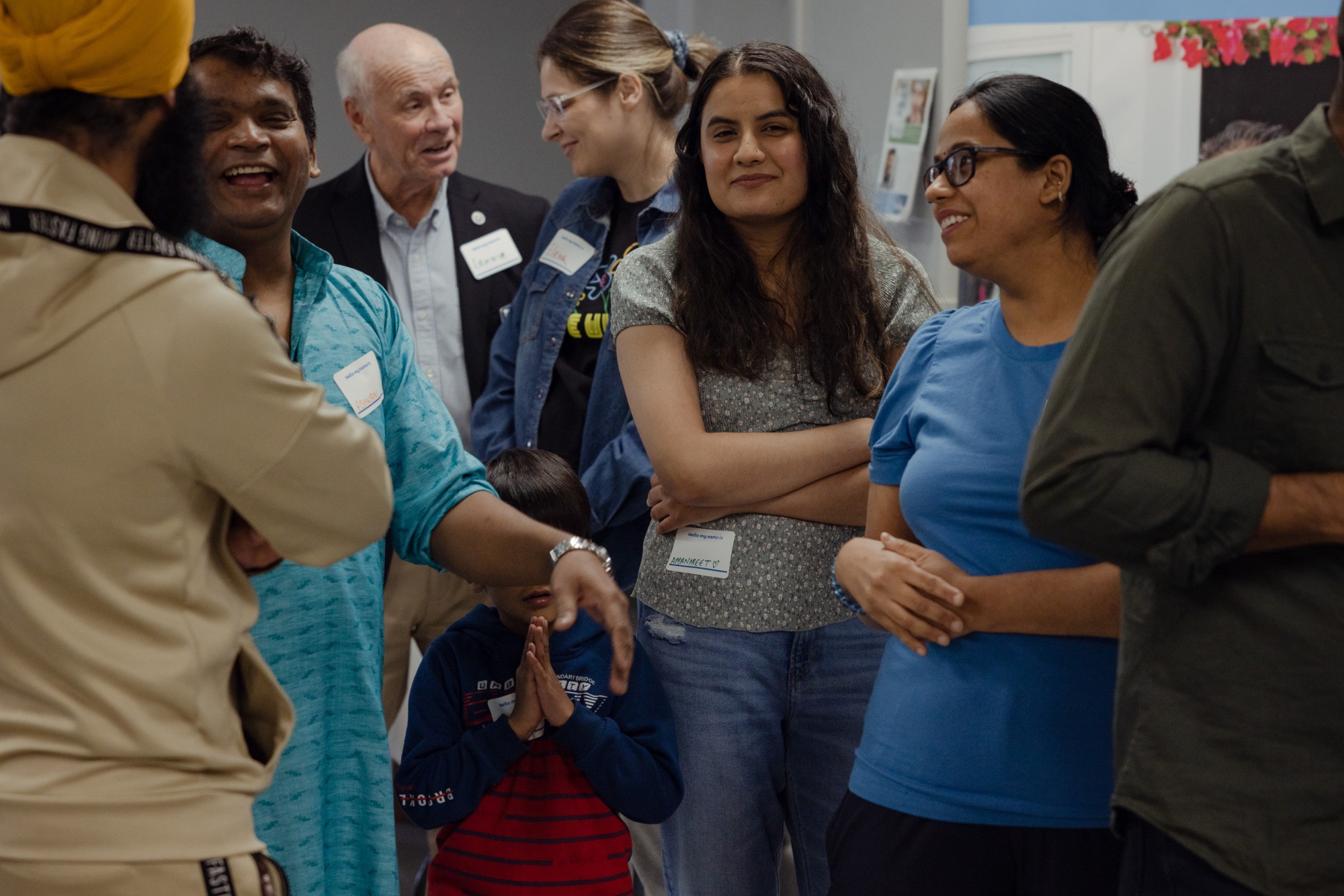 社区成员在新斯科舍省新格拉斯哥的皮克图县合作伙伴年度新移民社交活动中欢迎移民。