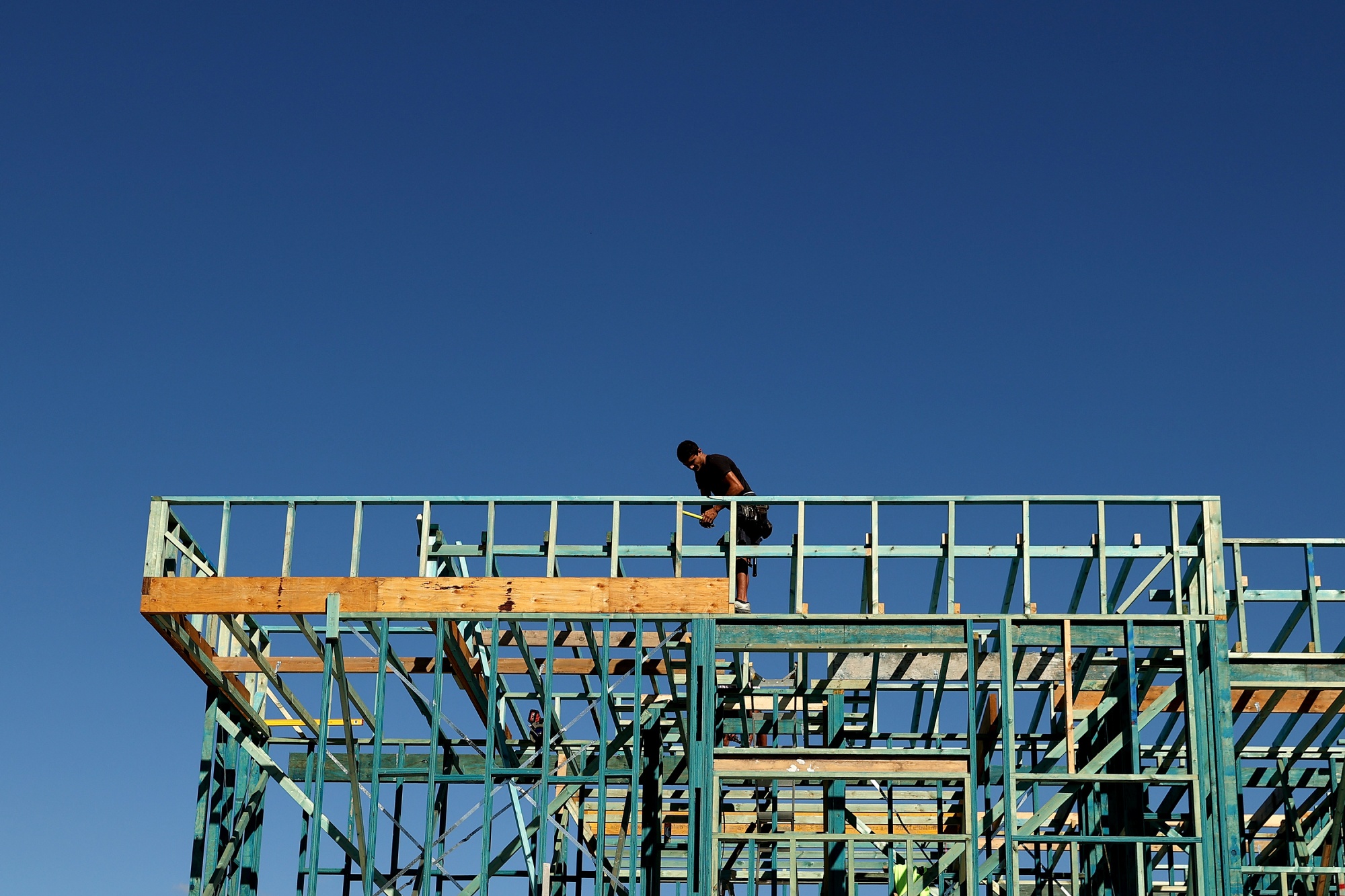 在悉尼Denham Court郊区一座正在建设中的房屋屋顶上的一名建筑工人。
