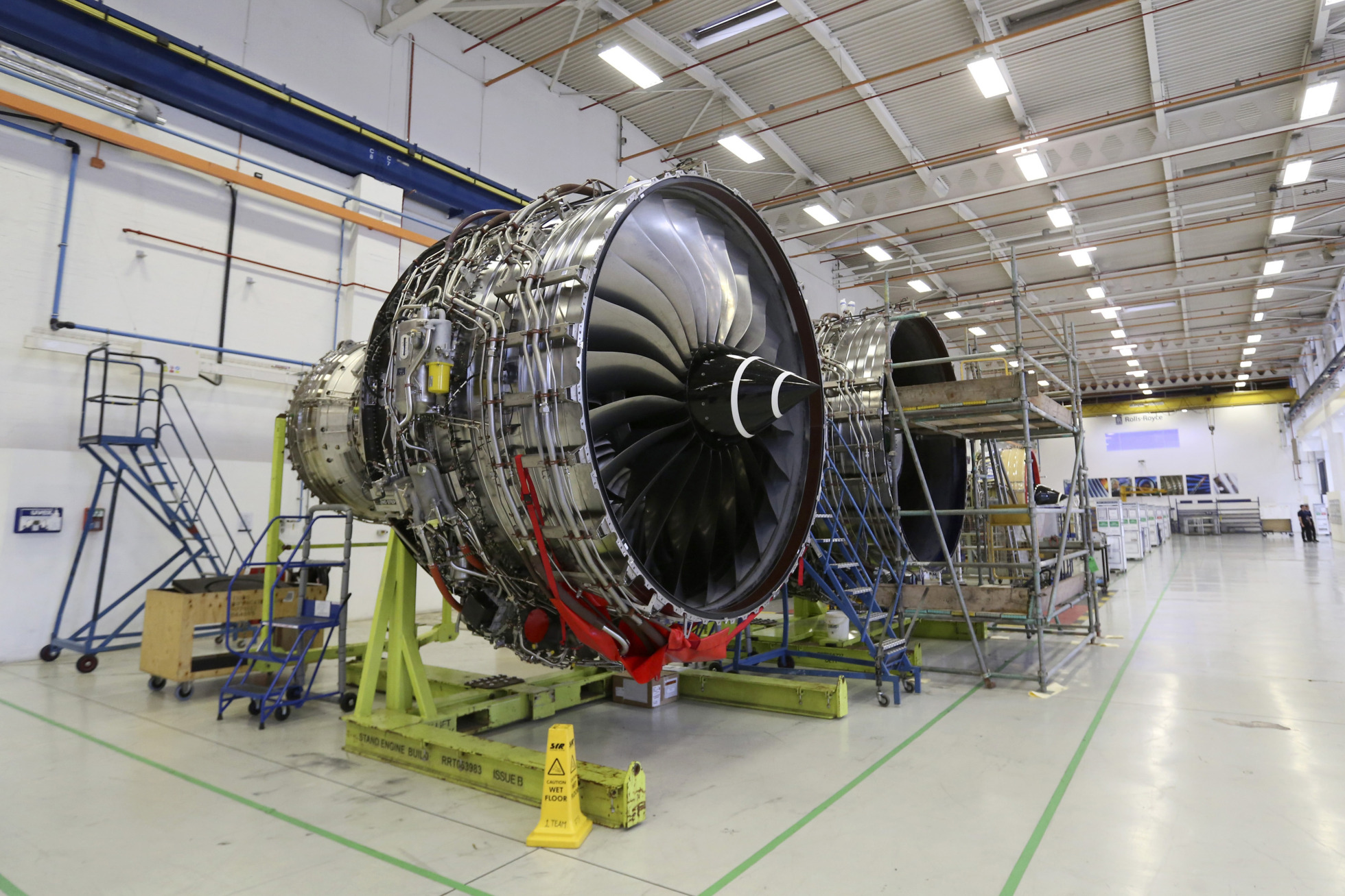 特伦特XWB飞机发动机在英国德比的劳斯莱斯工厂的生产线上展示。