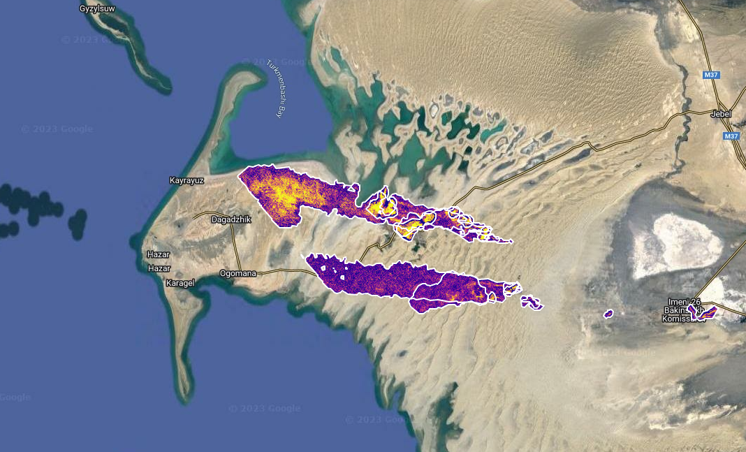 土库曼斯坦上空卫星观测到的甲烷排放量,时间跨度为2019年至今。