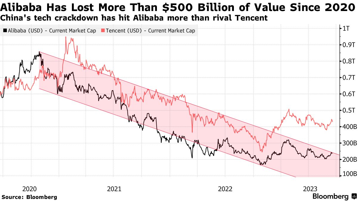 该公司从未恢复其高速增长,特别是随着字节跳动有限公司和PDD控股有限公司等新进入者削弱了其核心业务。它开始在云计算领域失去市场份额,这是其另一个增长引擎,被国有竞争对手所取代。