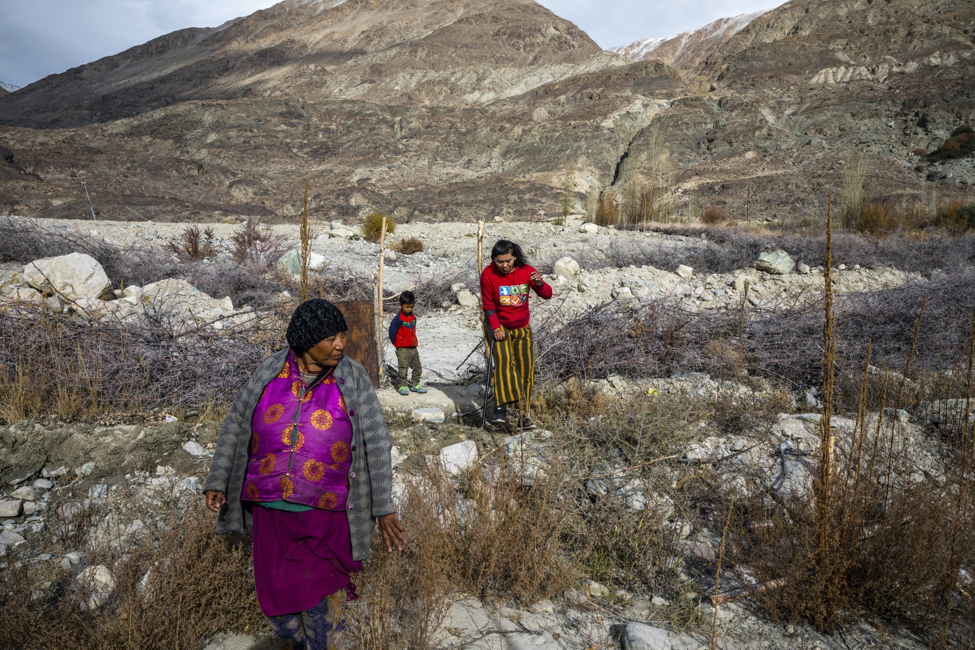 一家人展示他们的房子曾经位于的土地,该房子在2019年被印度拉达克努布拉的尤尔卡姆村被一场山洪冲走。