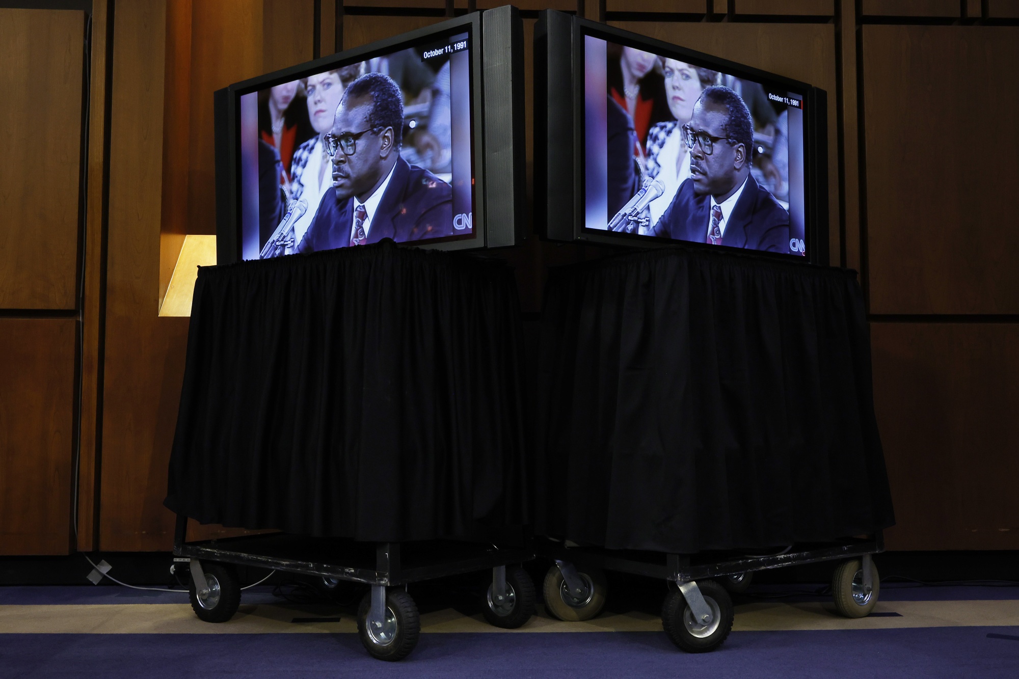 在五月份的参议院司法委员会关于司法伦理的听证会上,播放了托马斯大法官1991年确认时的视频。摄影师:Chip Somodevilla/Getty Images“他们没有意识到我们生活在一个不同的时代,他们可以在幕后做事而无人关心他们在搞什么 —— 那个时代已经过去了,”弗吉尼亚大学法学院的教授阿曼达·弗罗斯特说。“政客们已经意识到了这一点,我认为法庭还没有意识到自己必须比过去更加透明和负责。”