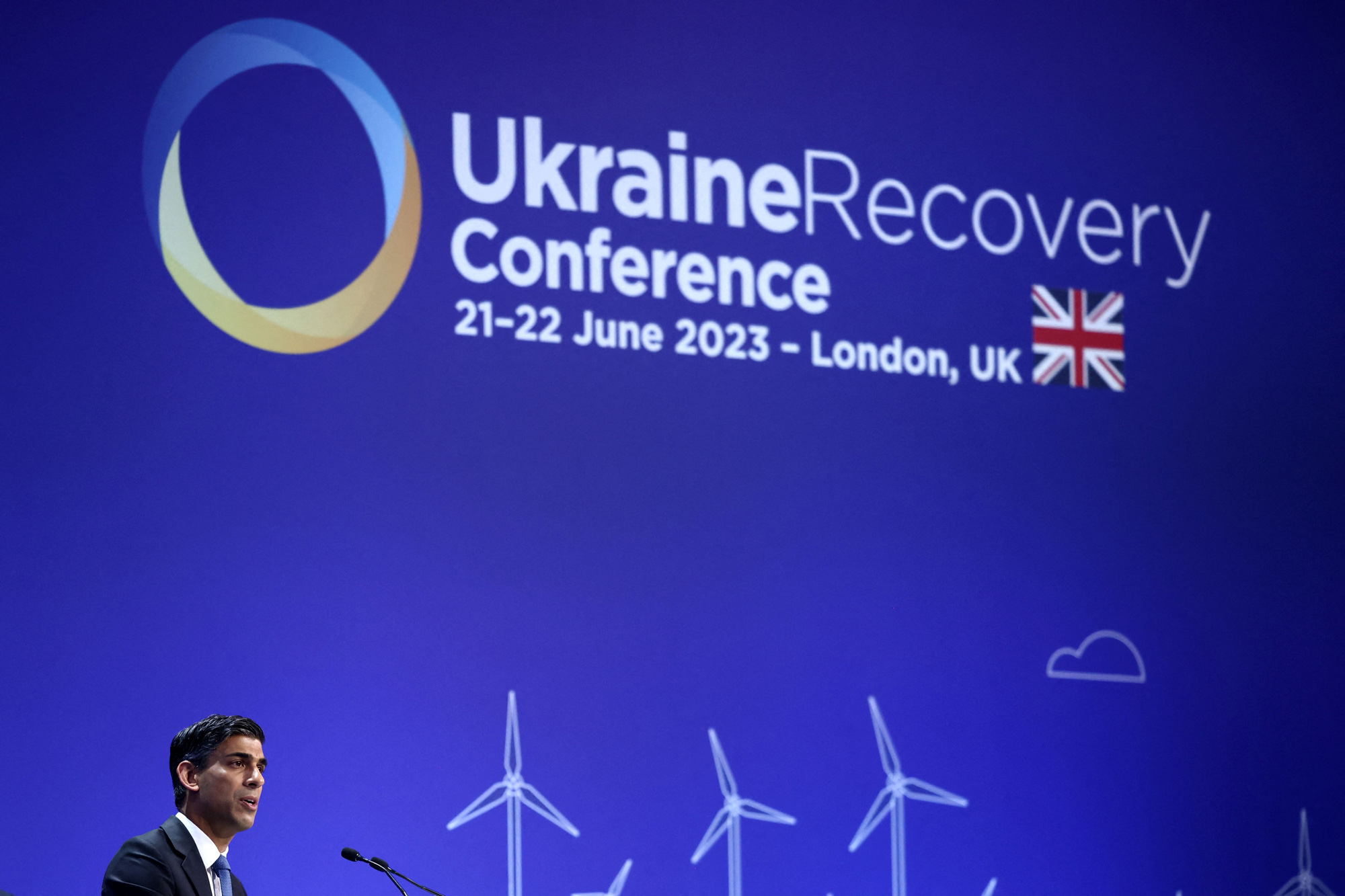 里什·苏纳克在6月21日伦敦举行的乌克兰复苏大会上发言。摄影师:亨利·尼科尔斯/法新社/盖蒂图片社苏纳克告诉大会代表们,这一保险框架“是向帮助保险公司承保对乌克兰的投资迈出的一大步,消除了最大的障碍之一,并给予投资者他们行动所需的信心”。