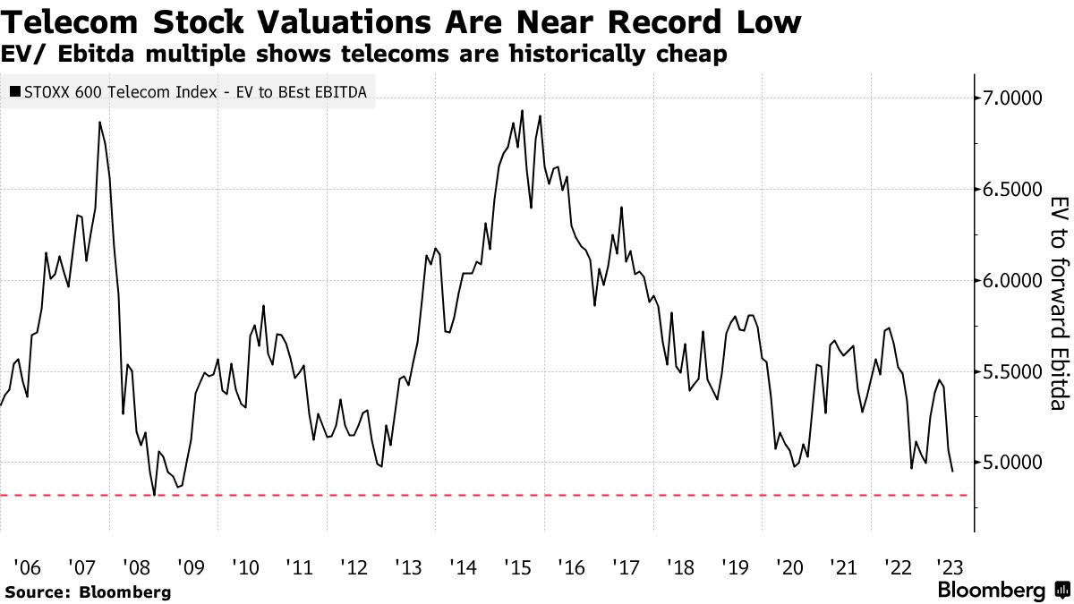 欧洲电信公司的估值接近历史最低水平,而该行业可预测的收入和可靠的股息可能会激发战略性和私募股权的兴趣。