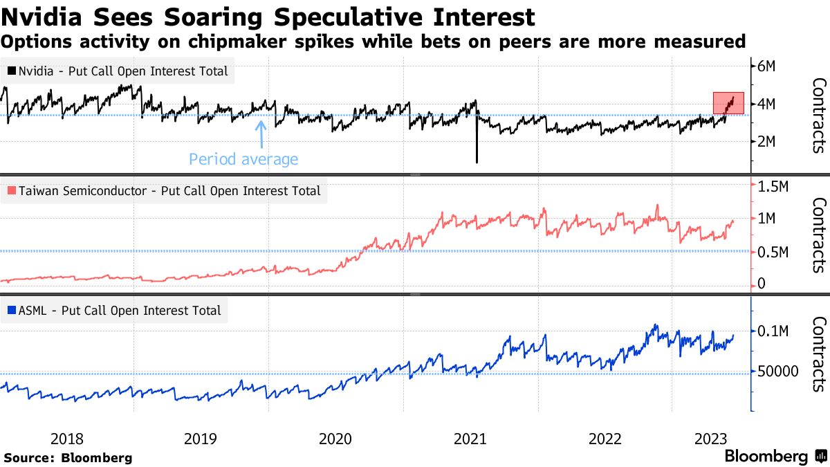 Nvidia交易员一直在购买期权,以押注该股票将上涨或下跌,将总体投机兴趣推至四年来的最高水平。对TSMC和ASML的美国存托凭证的投注也在上升,但尚未达到去年11月的峰值。