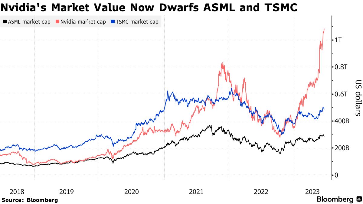 英伟达的市值已经突破了1万亿美元的大关,超过了ASML和台积电的市值总和。它现在比ASML大两倍,而在今年1月还不如后者,比台积电大四倍。