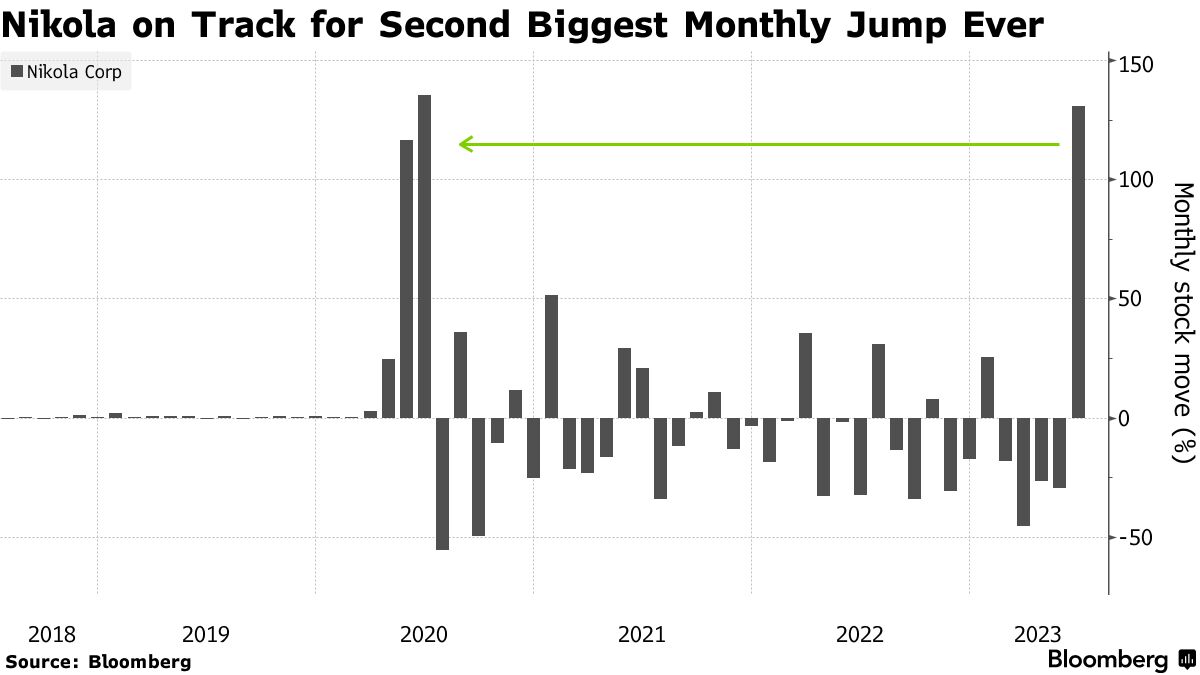 尼古拉公司股价在六月份已经翻了一番,随着其他成长和科技股在美联储暂停加息之后的反弹。上周,这家电动卡车制造商的创始人特雷弗·米尔顿被撤职,呼吁进行领导层变革,尼古拉表示这是他离职时所达成协议的“直接违反”。该股票仍比2020年的峰值下跌了98%,周四下跌了8.2%。