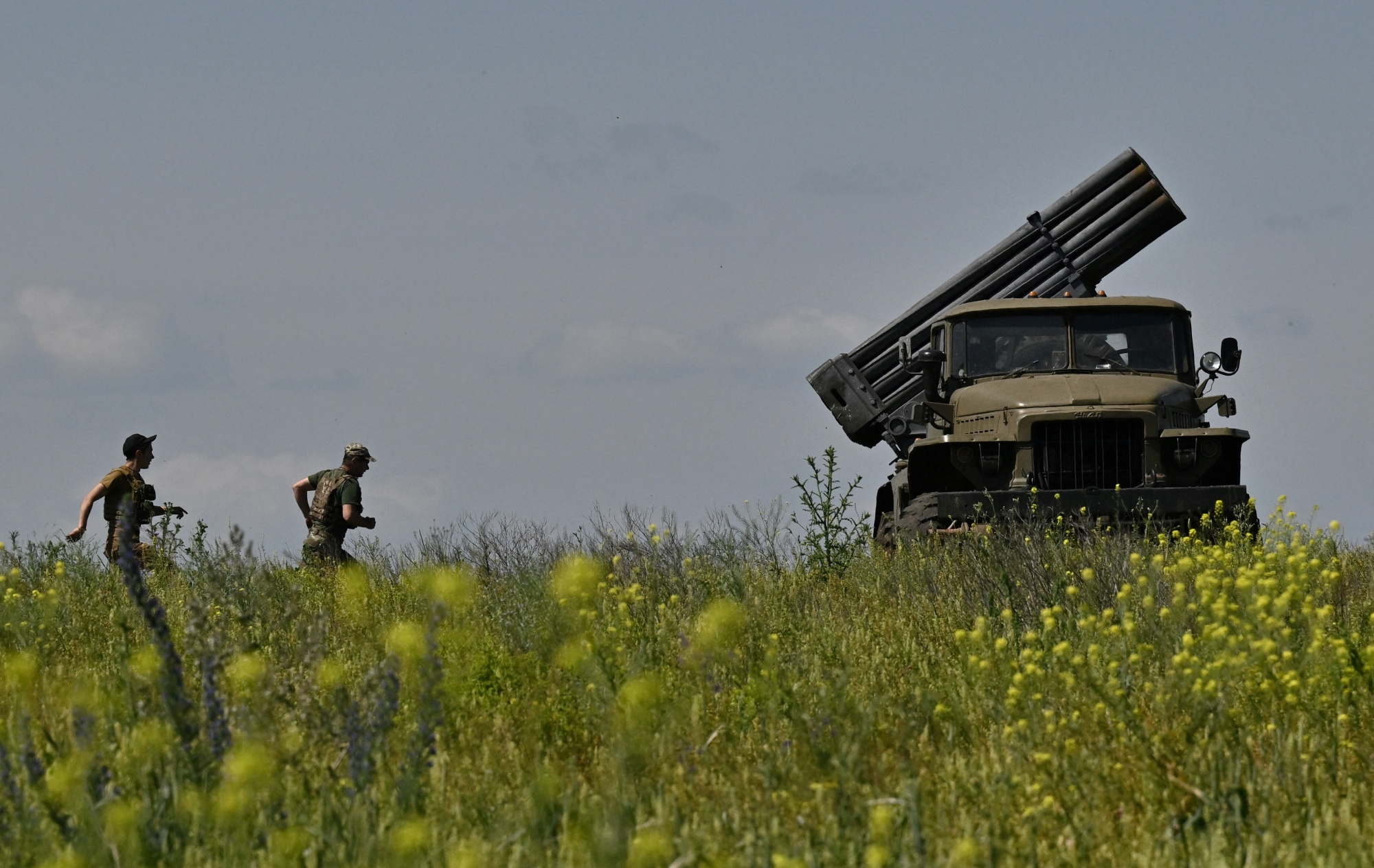 乌克兰军人准备在巴赫穆特附近发射多管火箭发射器。