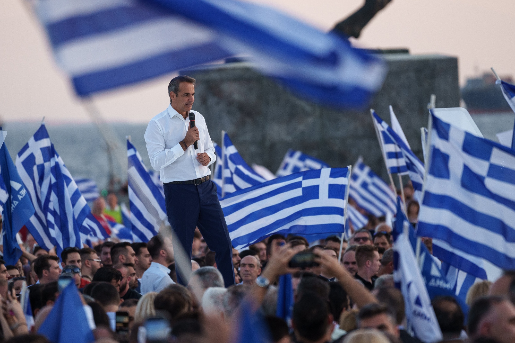 基里亚科斯·米佐塔基斯(Kyriakos Mitsotakis)在希腊塞萨洛尼基的一次选举集会上讲话,时间是6月21日。