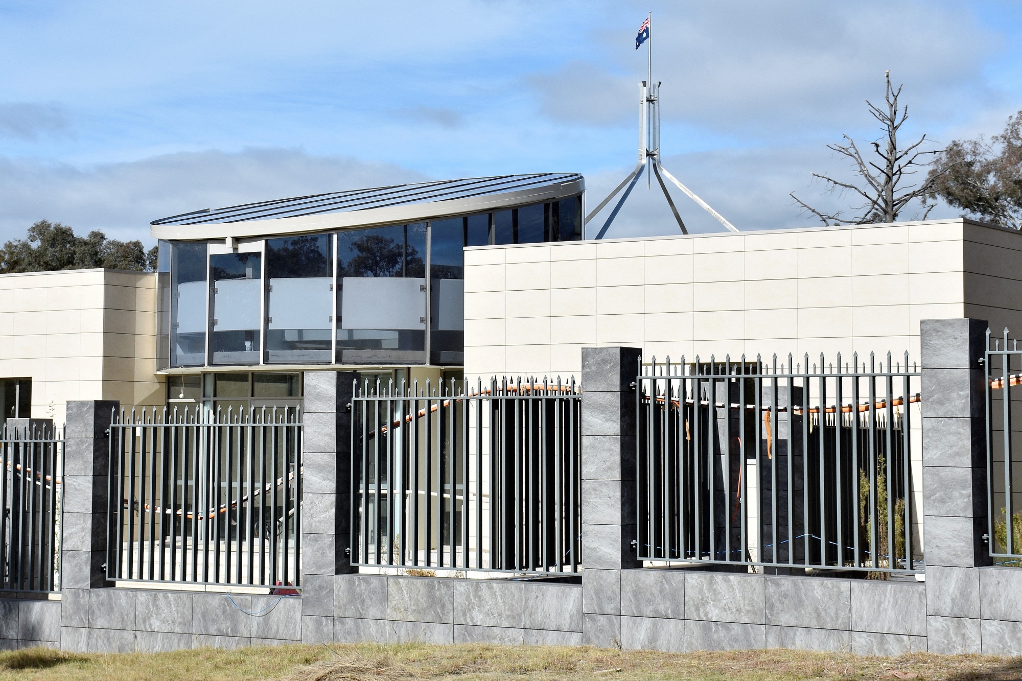 6月15日,澳大利亚国会大厦上的澳大利亚国旗,背后是一座正在建设中的俄罗斯驻堪培拉新大使馆的建筑。