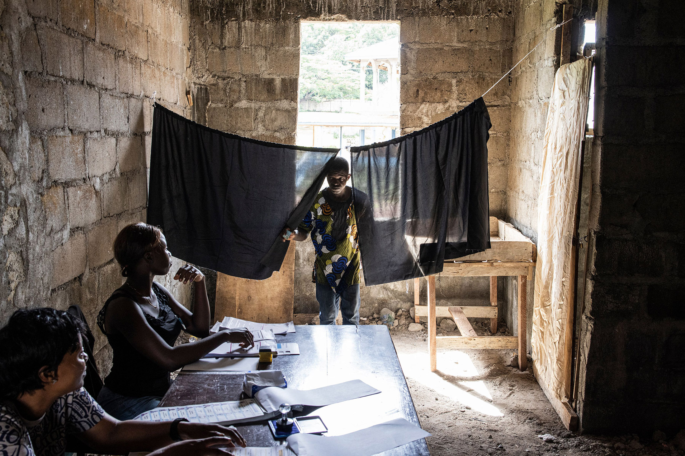 一名选民在塞拉利昂弗里敦的一个投票站投票,日期为6月24日。