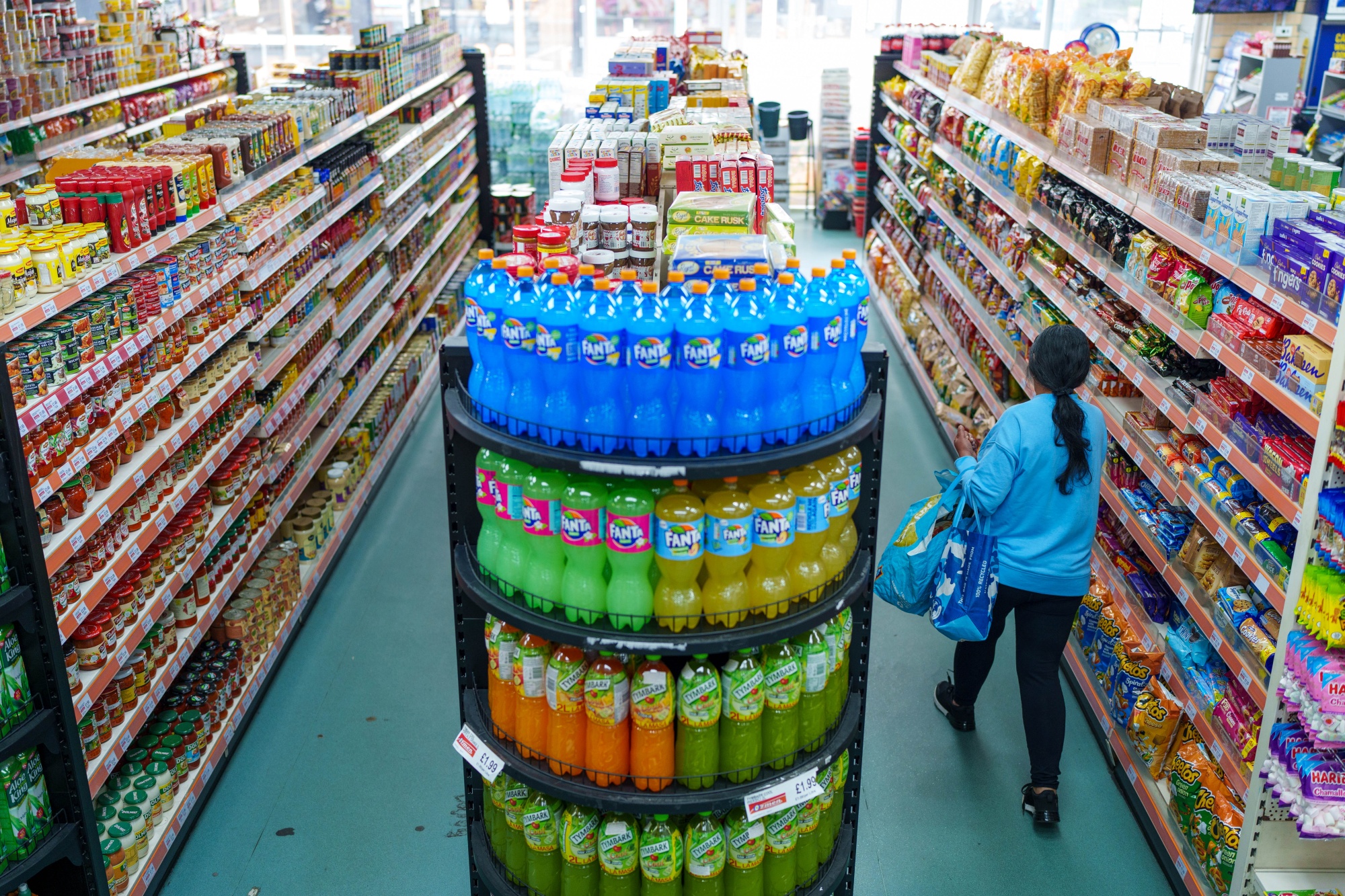 一名购物者在英国谢菲尔德的一家超市里选购食品。
