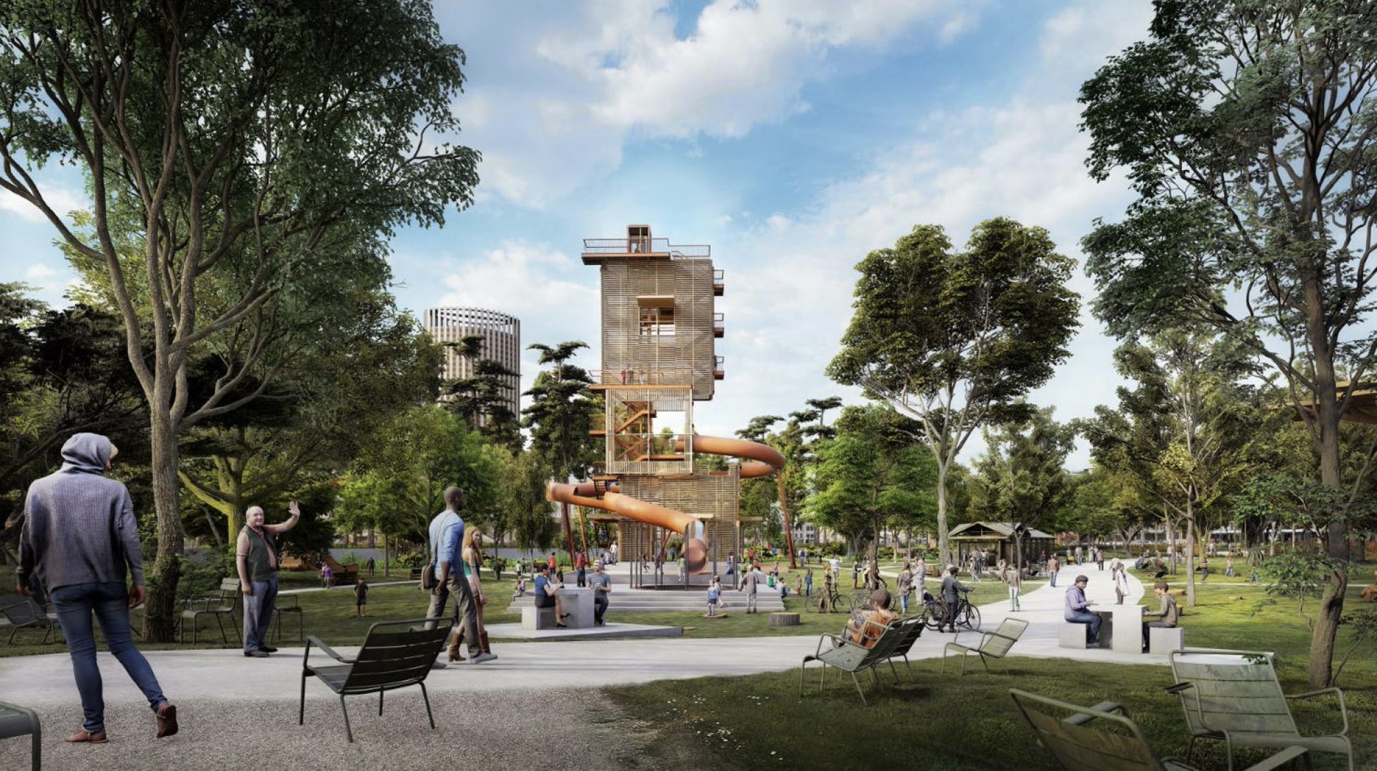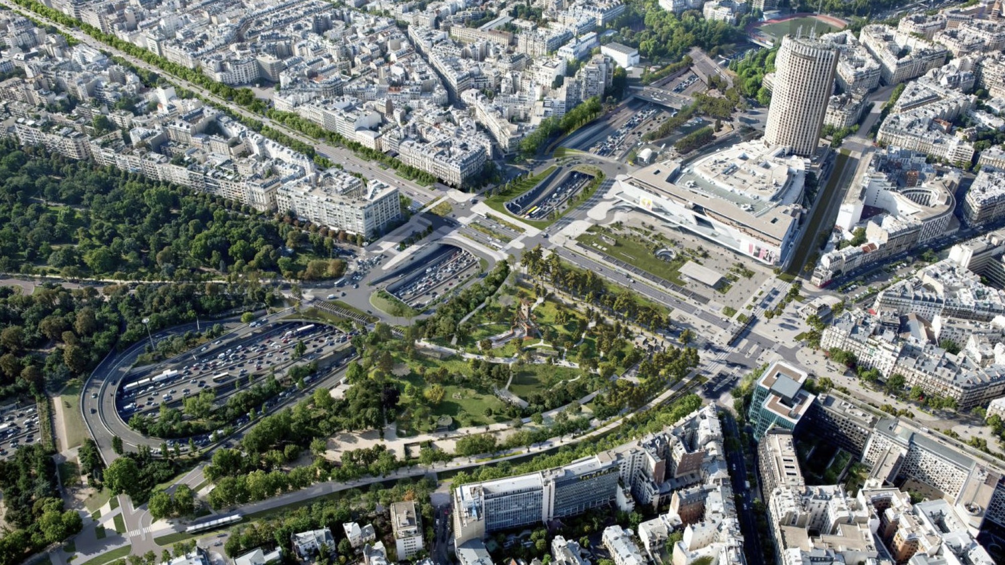 计划在波尔特马约与布洛涅森林交汇处建造的观景塔和游乐场的效果图。照片:©PCA-Stream在大道与波尔特马约环岛相交的地方——这是标志着历史城市通往郊区的所谓“巴黎之门”之一——正在进行更为系统化的重新布局。这个区域最初是一个宽阔的广场,于1970年代进行了重新开发,通过增加一个大型环岛来打破大道的连续性,主要是为了帮助车辆进入新建的环城公路。这使该区域充斥着交通,为非环城车辆造成瓶颈,并损害了凯旋门与正在建设中的商业区拉德芬斯之间的长途视野。它还取消了从大道到附近的公园——布洛涅森林的便捷步行通道,布洛涅森林。
