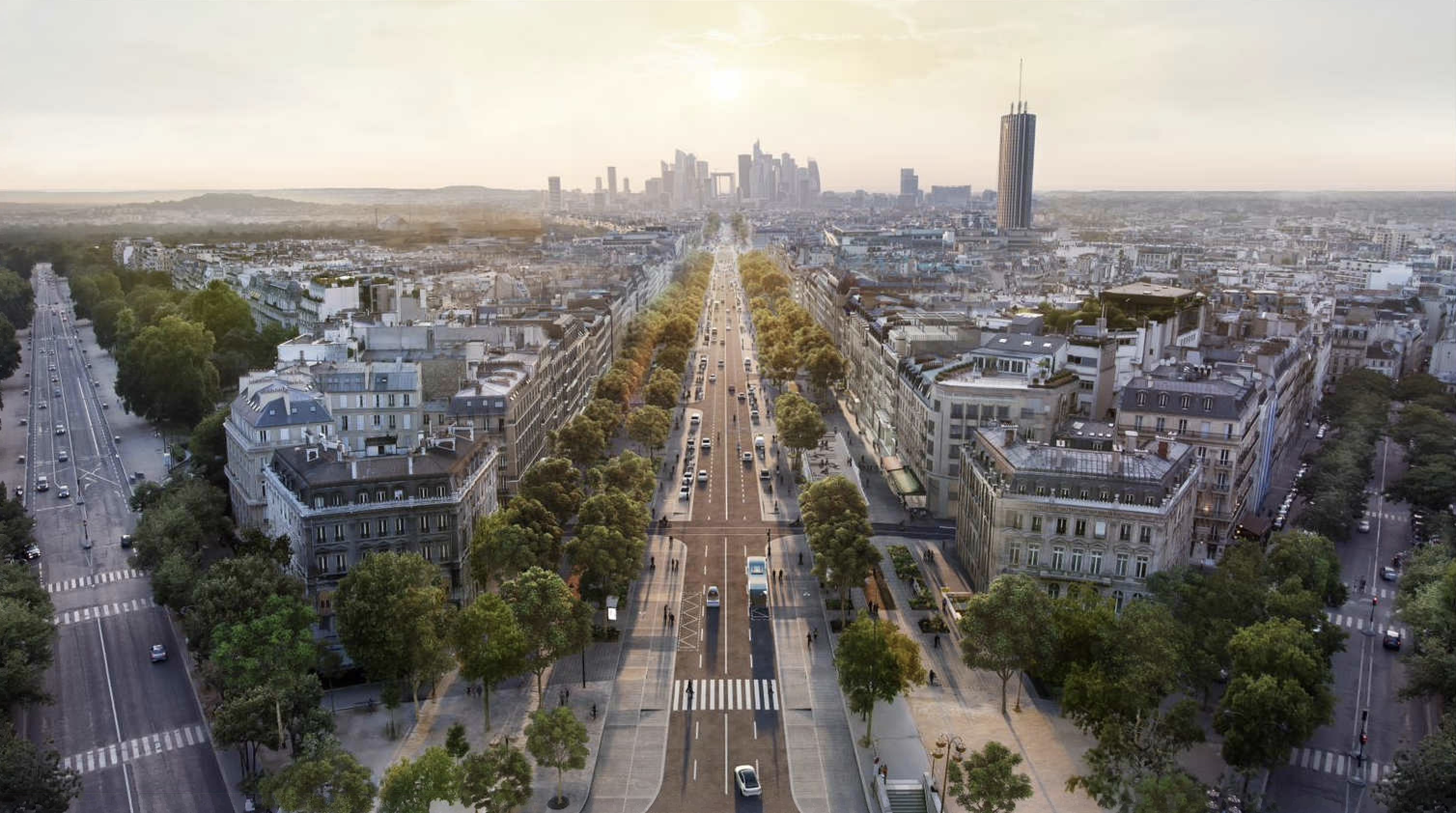 一幅从凯旋门顶部俯瞰的大军大道的效果图,工程完成后可能会呈现这样的景象。