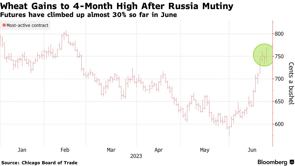 小麦攀升至创四个月新高,因为俄罗斯顶级出口国发生武装起义,给黑海面包篮子的粮食出口前景增添了不确定性。
