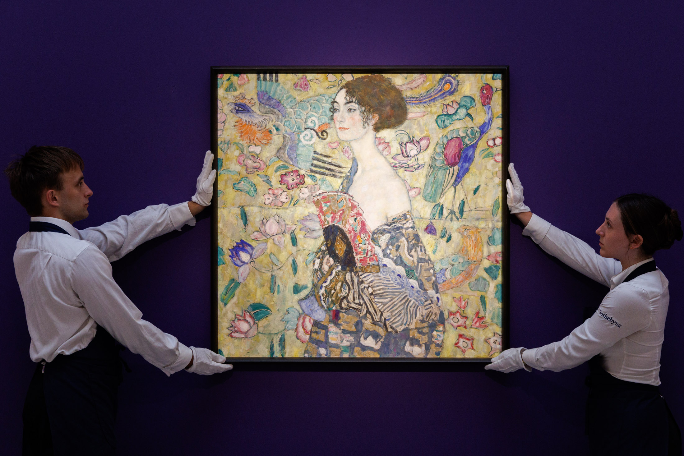 古斯塔夫·克里姆特的一幅肖像在周二于伦敦苏富比拍卖行以8530万英镑(1.084亿美元)的价格售出,成为欧洲拍卖会上售价最高的艺术品。之前的纪录是在2010年创下的,当时贾科梅蒂的行走的人在伦敦以6500万英镑的价格售出。这幅克里姆特的作品,扇子女士(Lady with a Fan),预估价格约为6500万英镑,创作于1917-1918年,有一个不可撤销的竞标。
