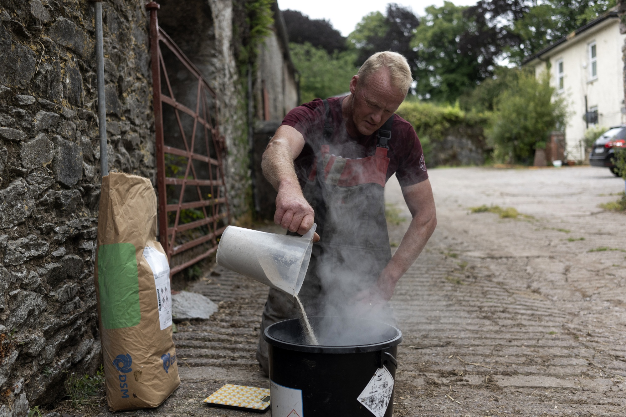 爱尔兰奶农彼得·海恩斯在爱尔兰科克郡的小村庄阿赫拉的家庭农场为牛准备饲料添加剂 Bovaer。